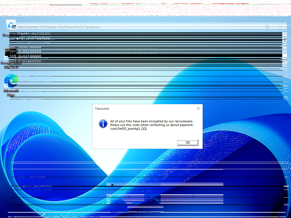 The reconstruction produced an actual frame of what the victim saw right before being locked out. You can see a Windows desktop session and the attacker’s injected / malicious dialog. The flag is visibly rendered in that dialog.